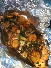 I had a side of salmon – skinless and boneless – weighing in at almost 2kg in the fridge, and had thoughts about poaching it, and lemons and working fennel in somewhere. Then I considered baking and did some Googling.