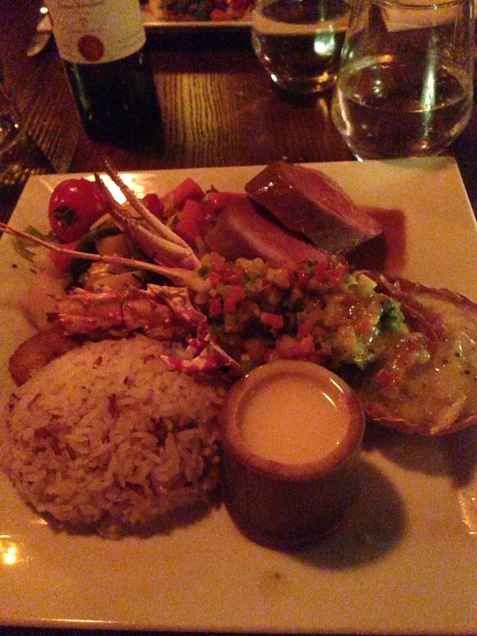 The menu (an example can be found here, though we had slightly different options and prices were higher) is largely surf and / or turf. There is a strong and deliberate nod to Caribbean – or as DLRP calls it, ‘exotic’ – cuisine, with ingredients like cassava and a healthy smattering of fruity salsas and spices thrown in any given dish. As a result, this is not a location for picky eaters or those who prefer simple dishes. My starter of swordfish, octopus salad and a an avocado mousse was generous, and though the octopus salad tasted a bit canned, the rest was excellent. Ashley’s included a hunk of super-soft black pudding, prawns, more avocado and little fried bites of deliciousness. We also gorged far too much on bread rolls (the standard mini baguette found at all breakfast buffets) and butter alongside it, but this is a pretty indulgent place, so perhaps we can be forgiven.