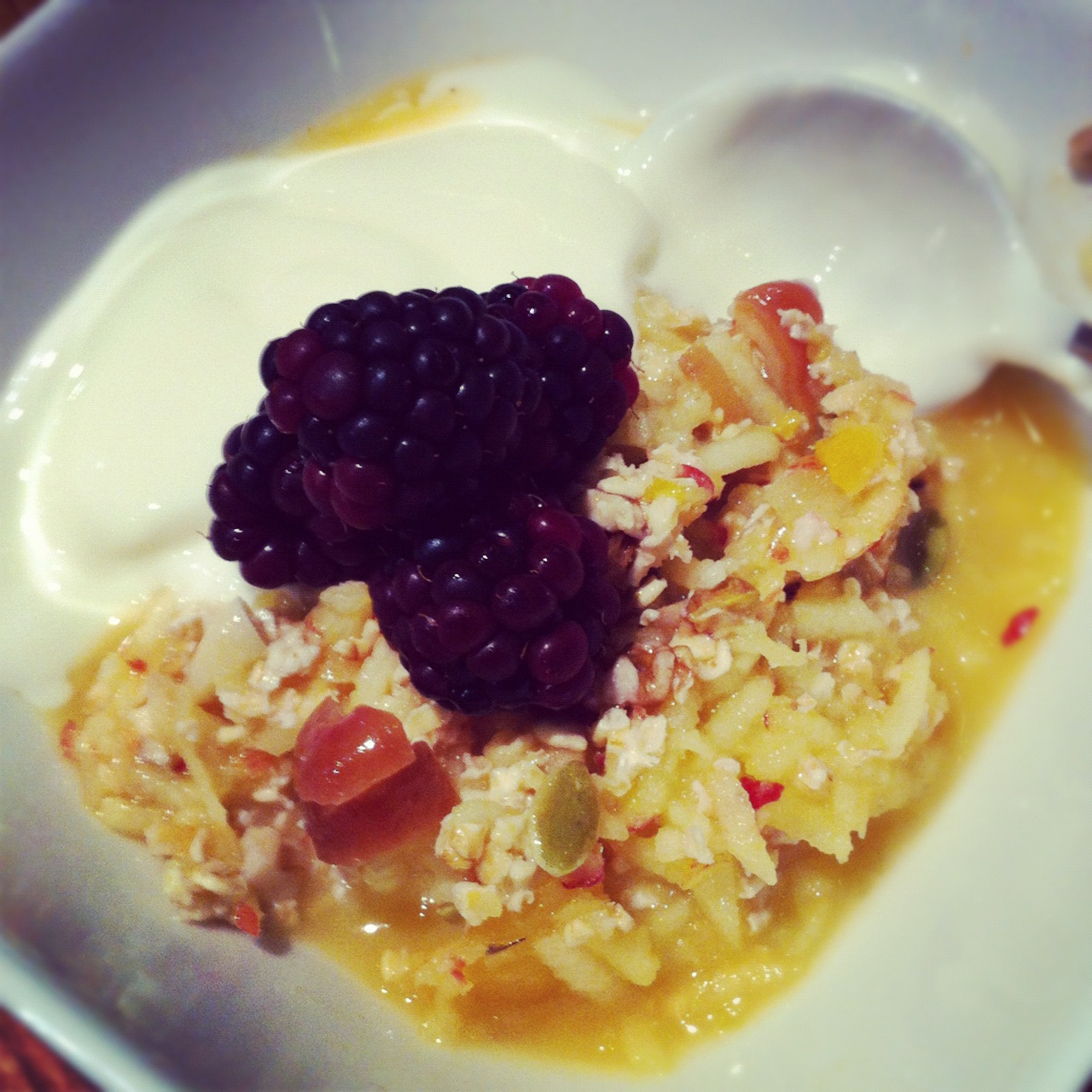 Mine, as you can see, was considerably runnier. I think the lack of wheat flakes wasn’t quite balanced out by extra oats, and therefore the apple added more moisture. That in turn meant some of the orange juice wasn’t absorbed. Don’t get me wrong – it was / is delicious. But you will need to judge the liquid content and do some experimentation if you don’t want to have to strain it before eating or just put up with slightly watery yogurt. Best made the night before.